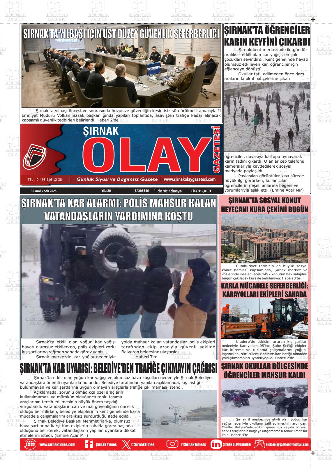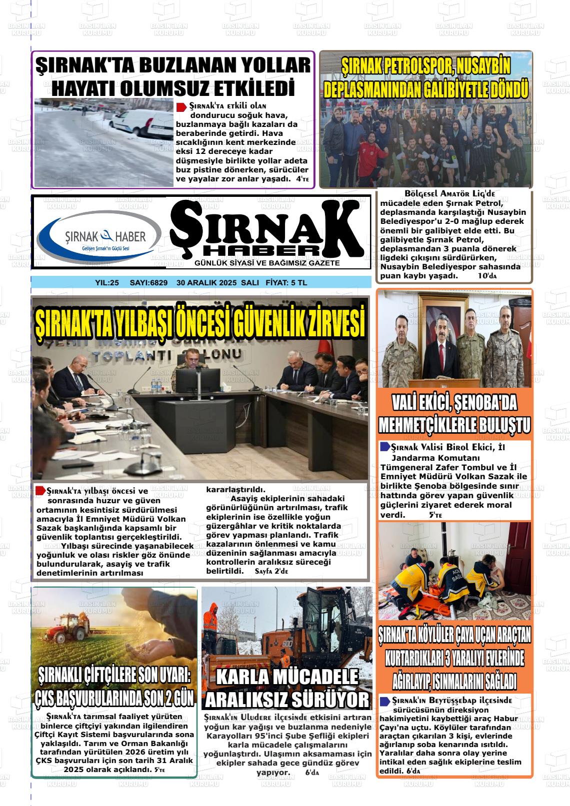 Şırnak Yerel Gazeteleri 30 Aralık 2025, Salı Günü Manşeti