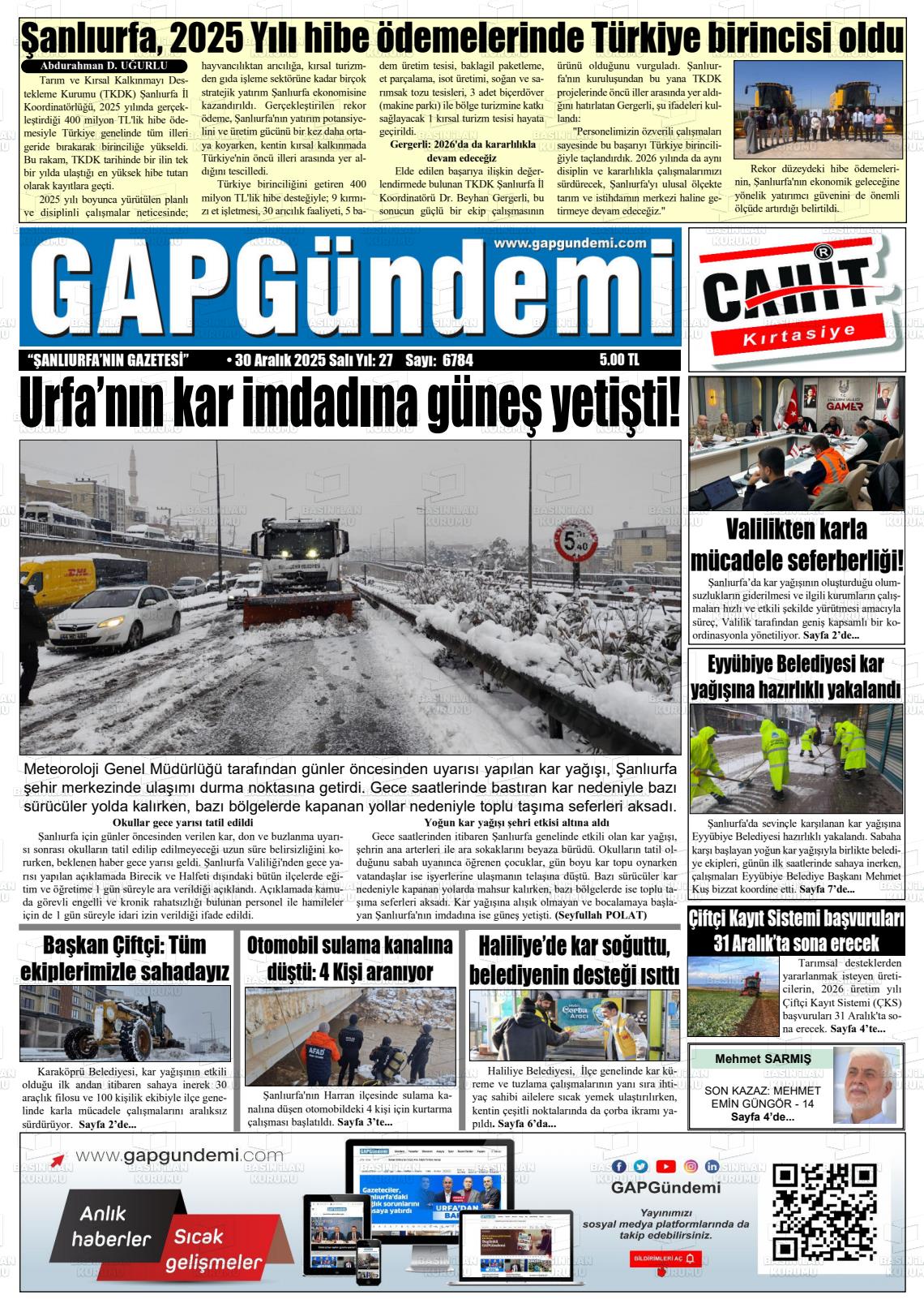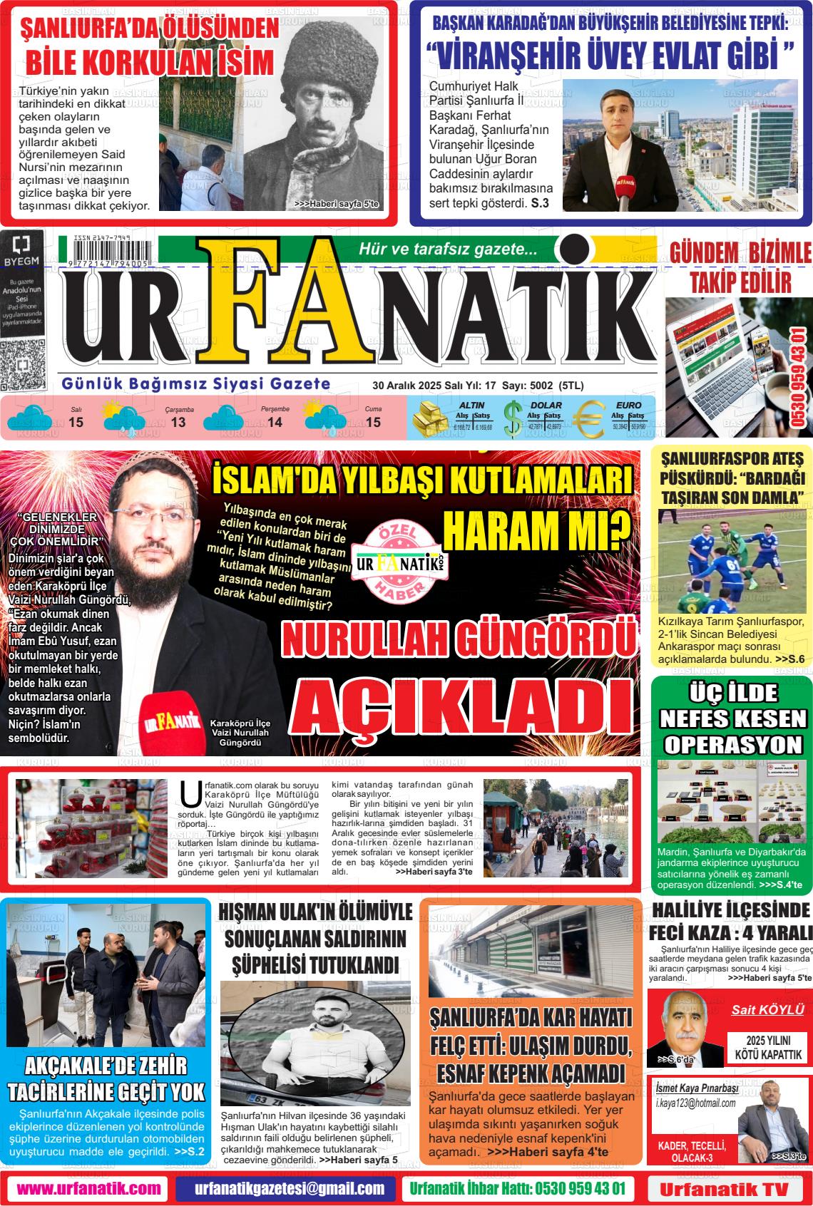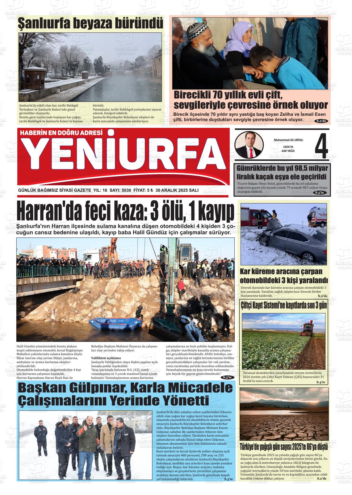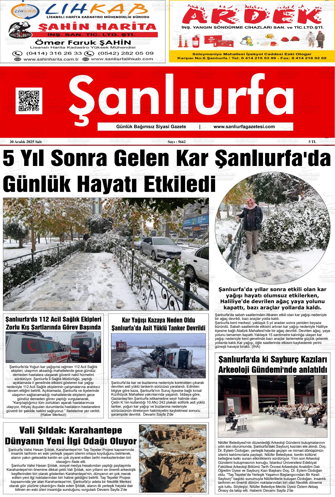 Şanlıurfa Yerel Gazeteleri 30 Aralık 2025, Salı Günü Manşeti