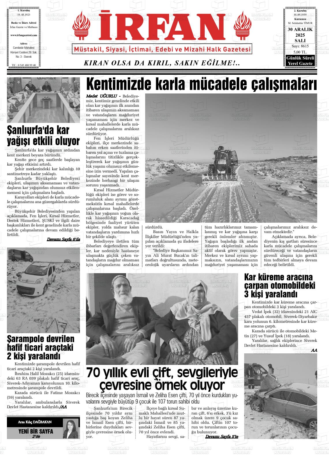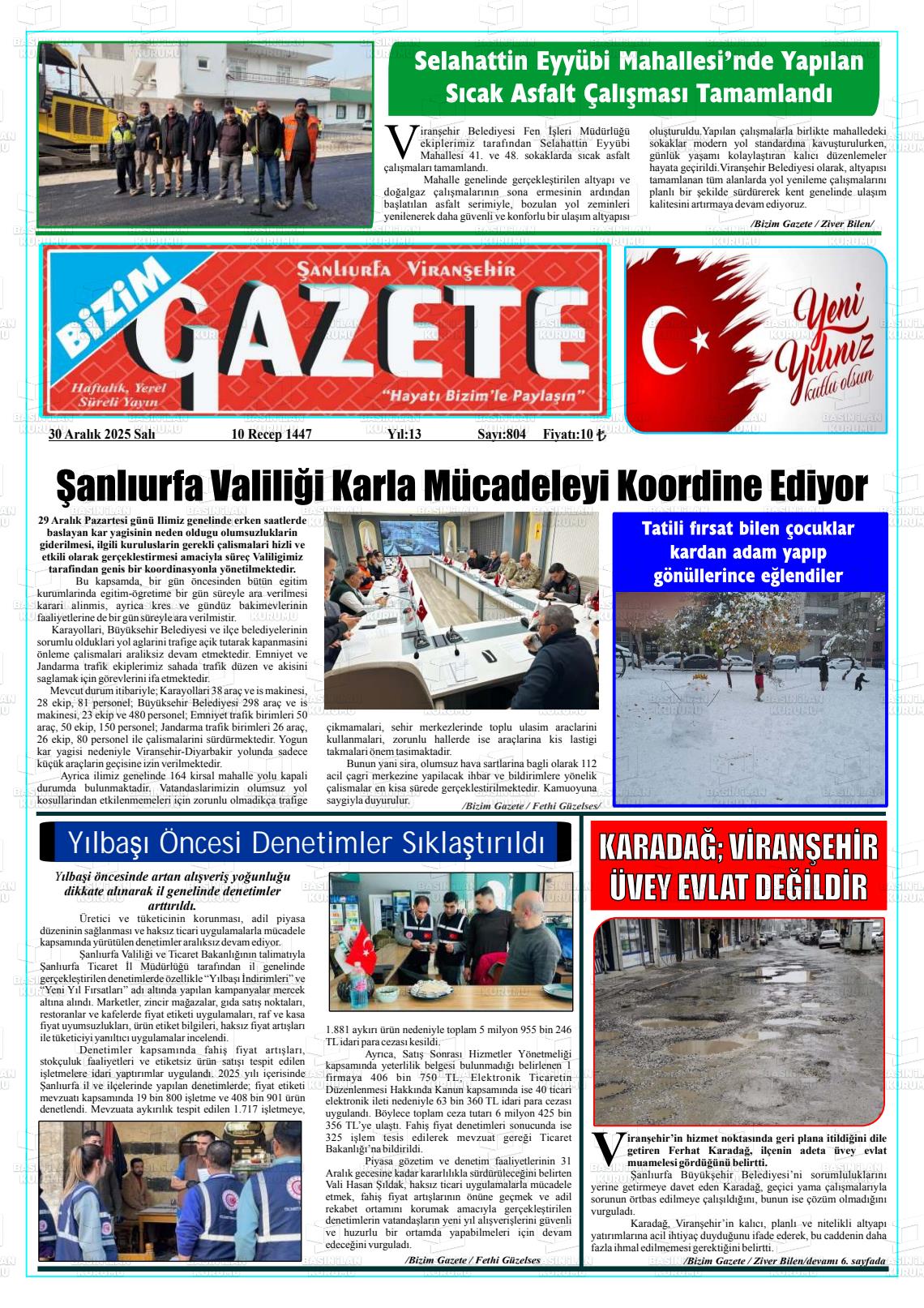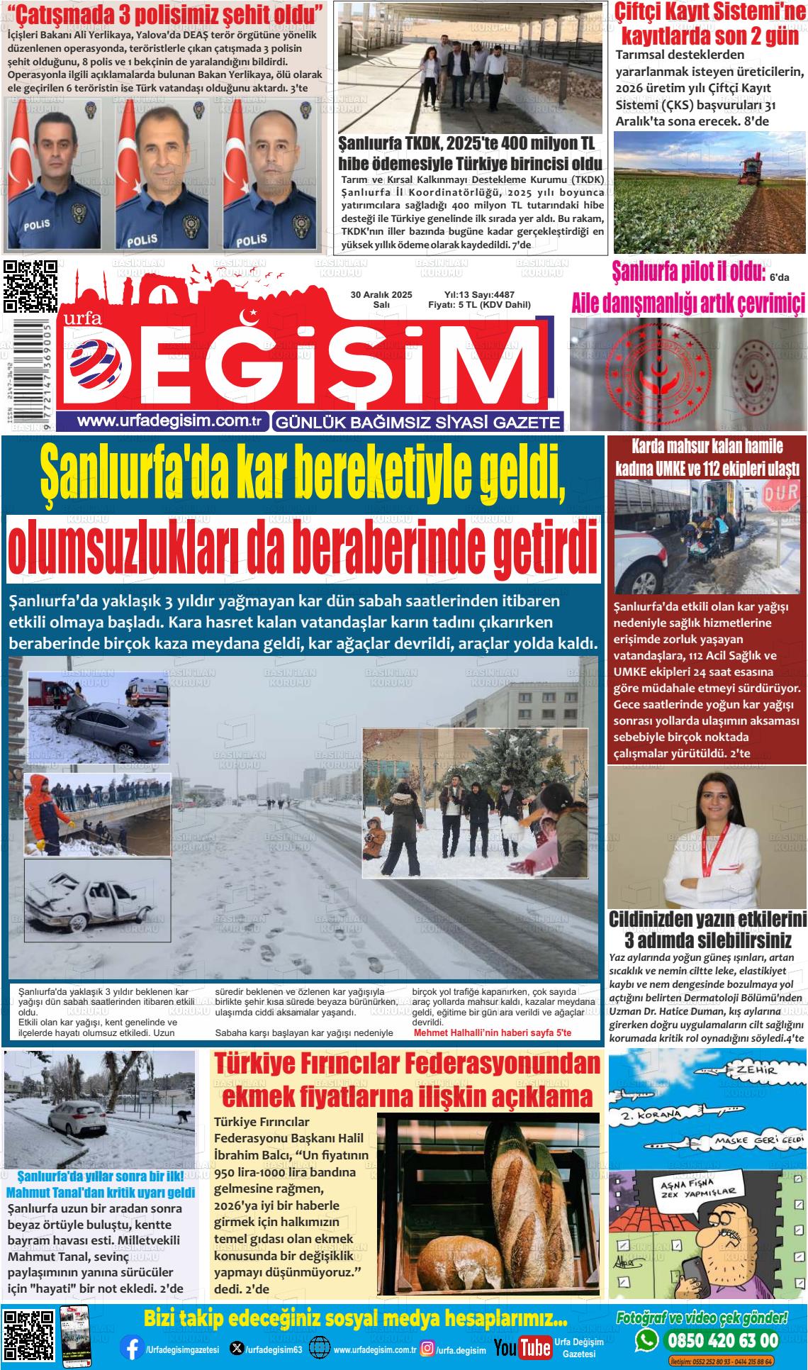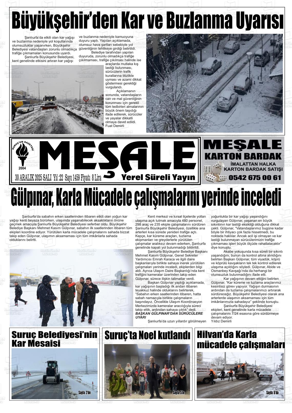 Şanlıurfa Yerel Gazeteleri 30 Aralık 2025, Salı Günü Manşeti