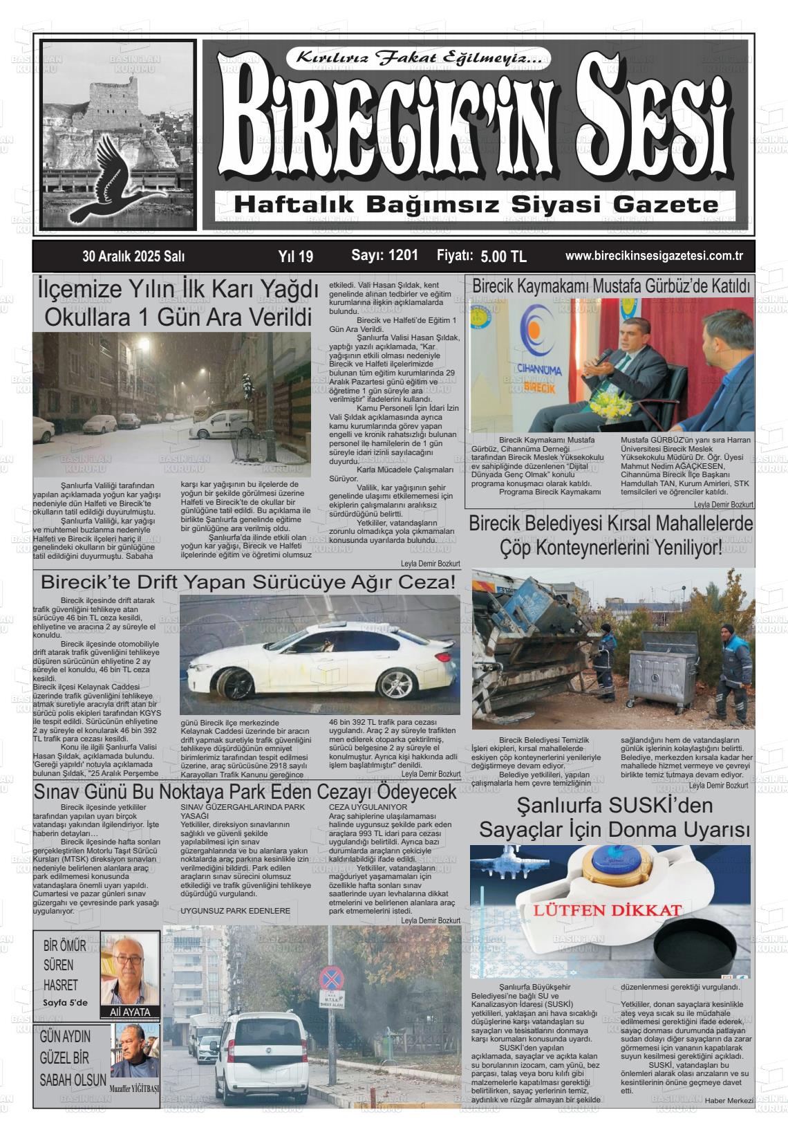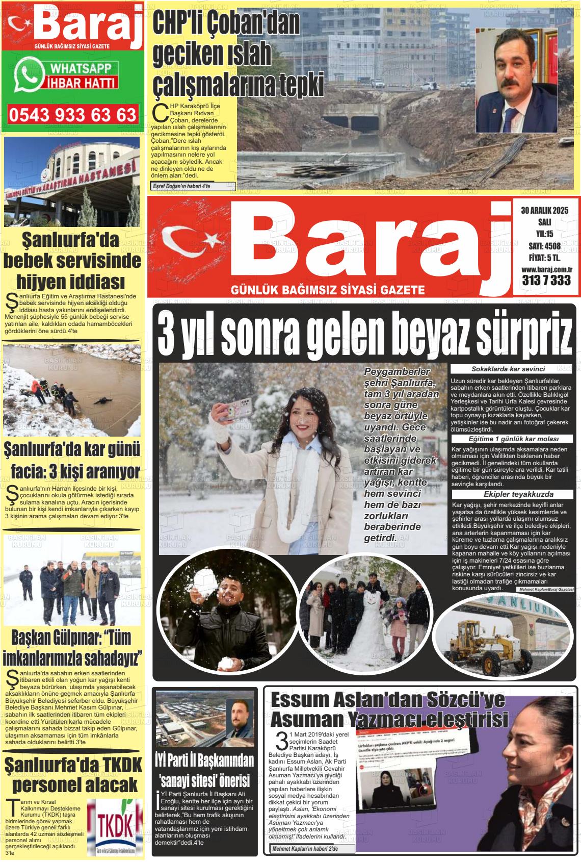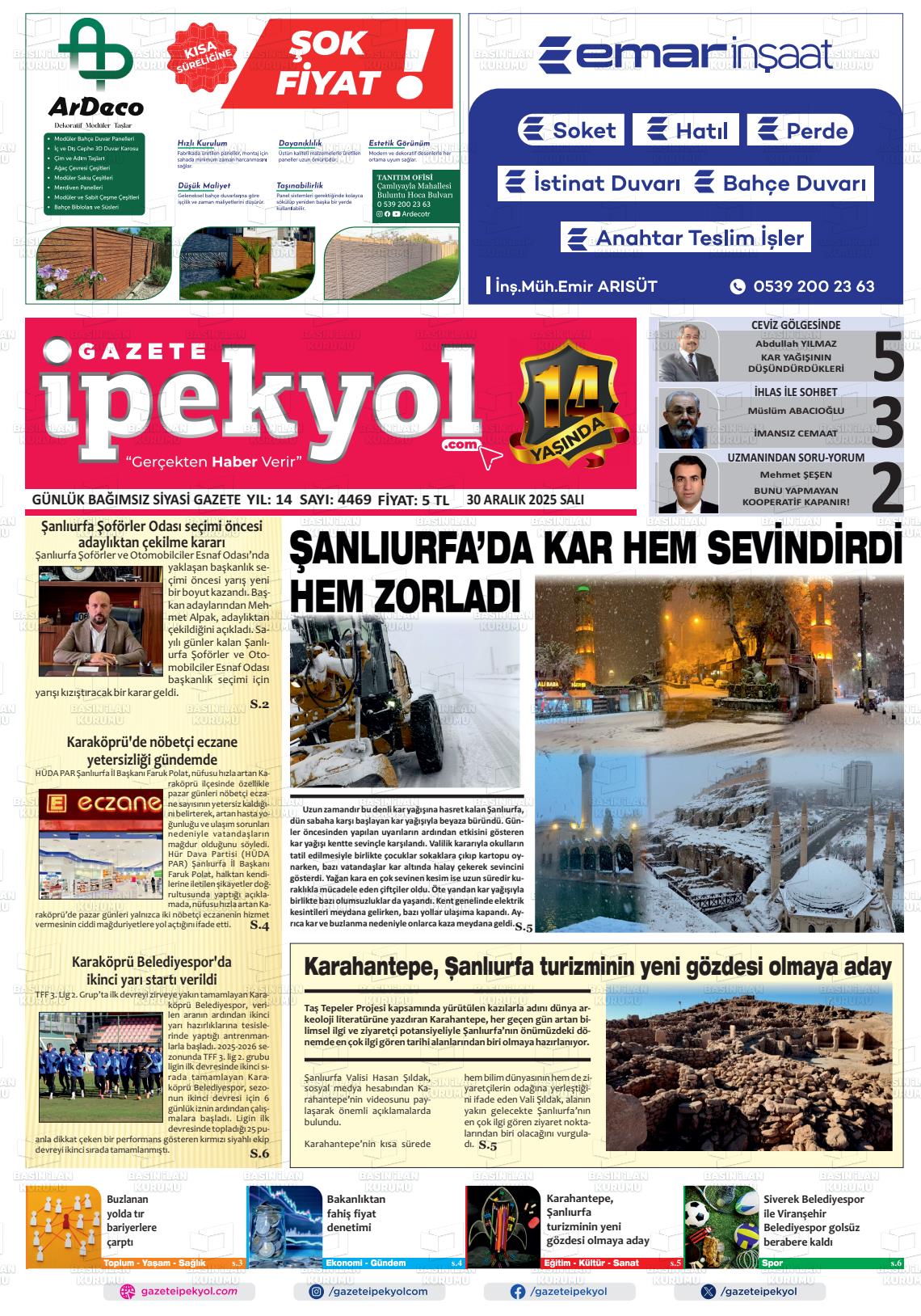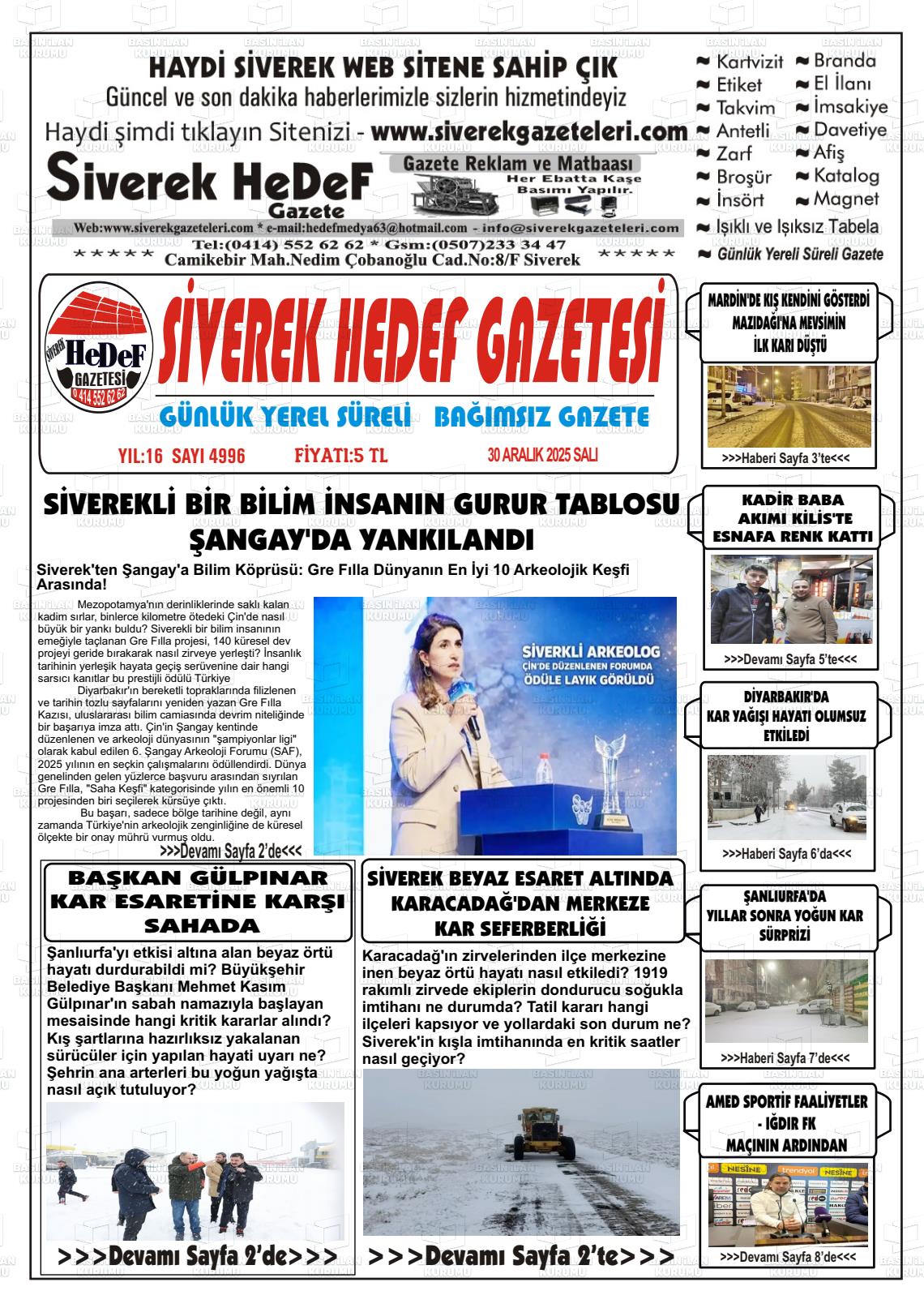 Şanlıurfa Yerel Gazeteleri 30 Aralık 2025, Salı Günü Manşeti