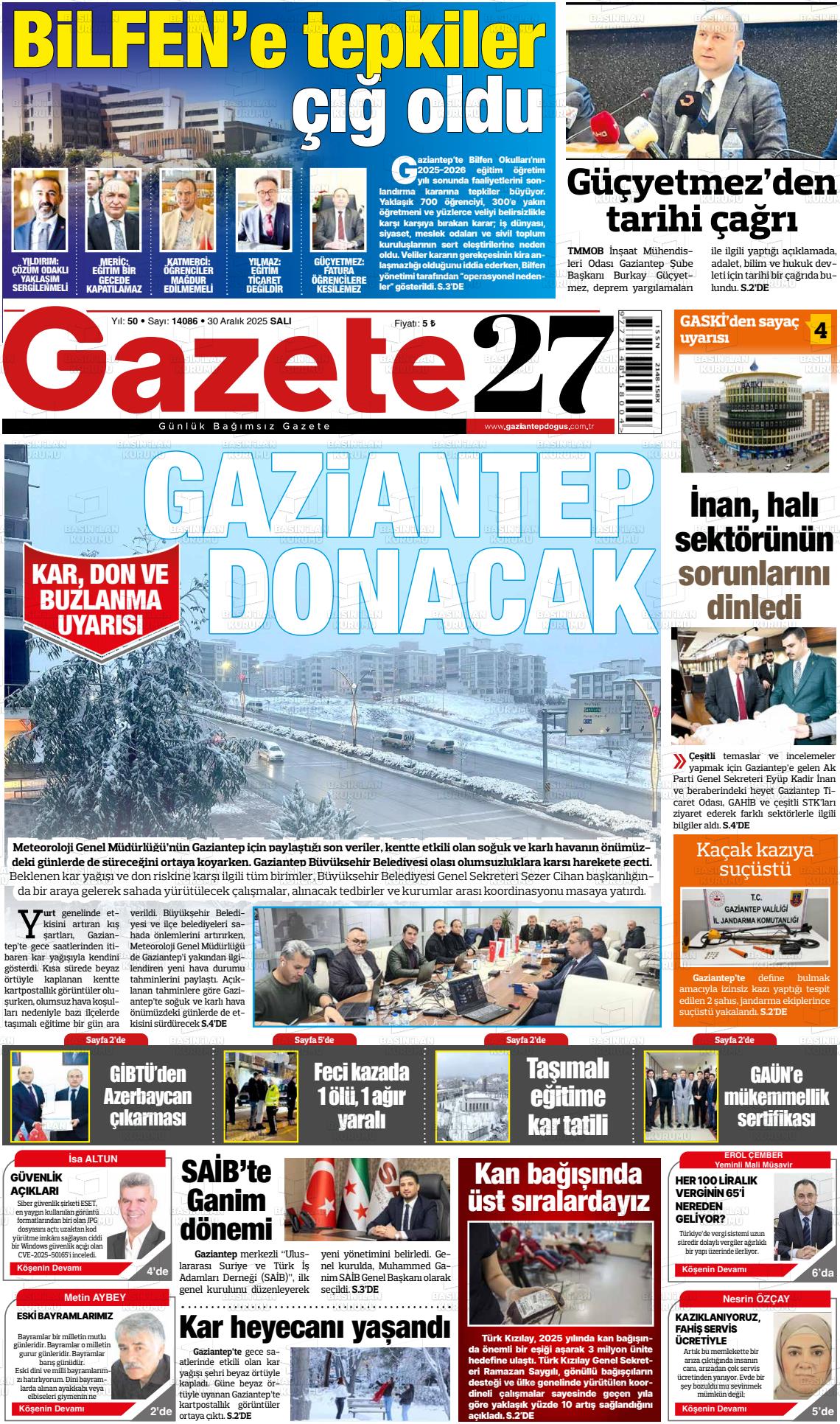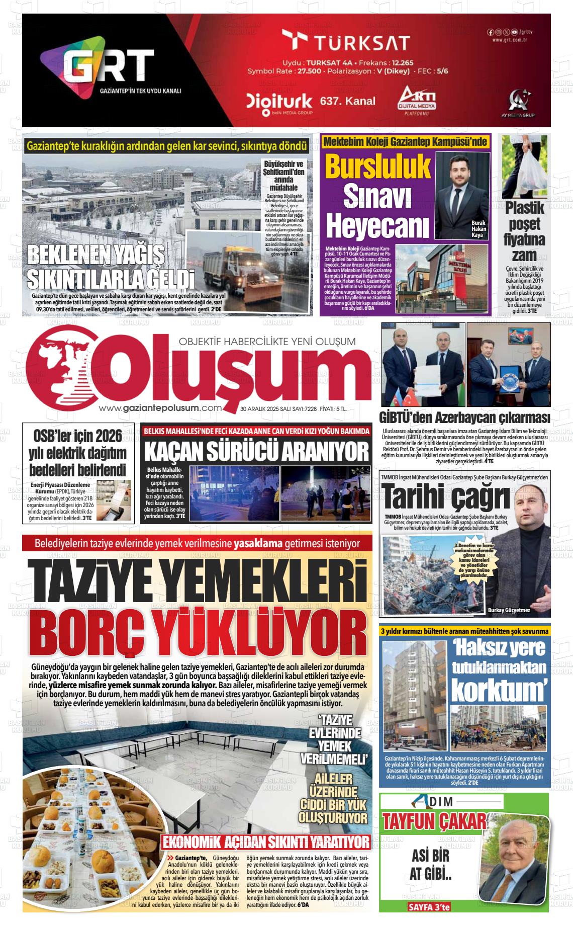 Gazİantep Yerel Gazeteleri 30 Aralık 2025, Salı Günü Manşeti