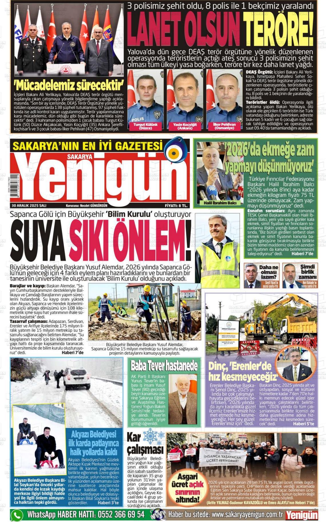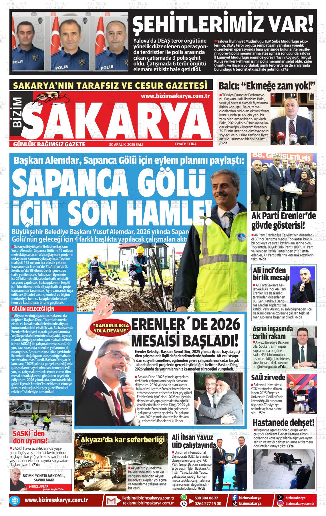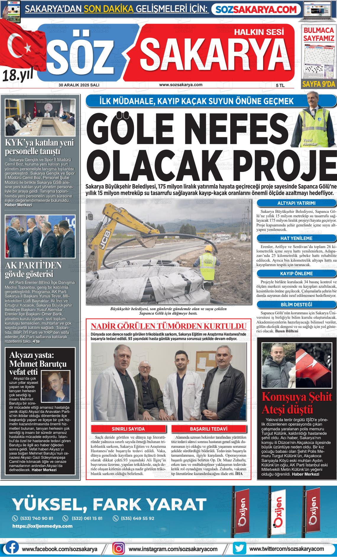 Sakarya Yerel Gazeteleri 30 Aralık 2025, Salı Günü Manşeti