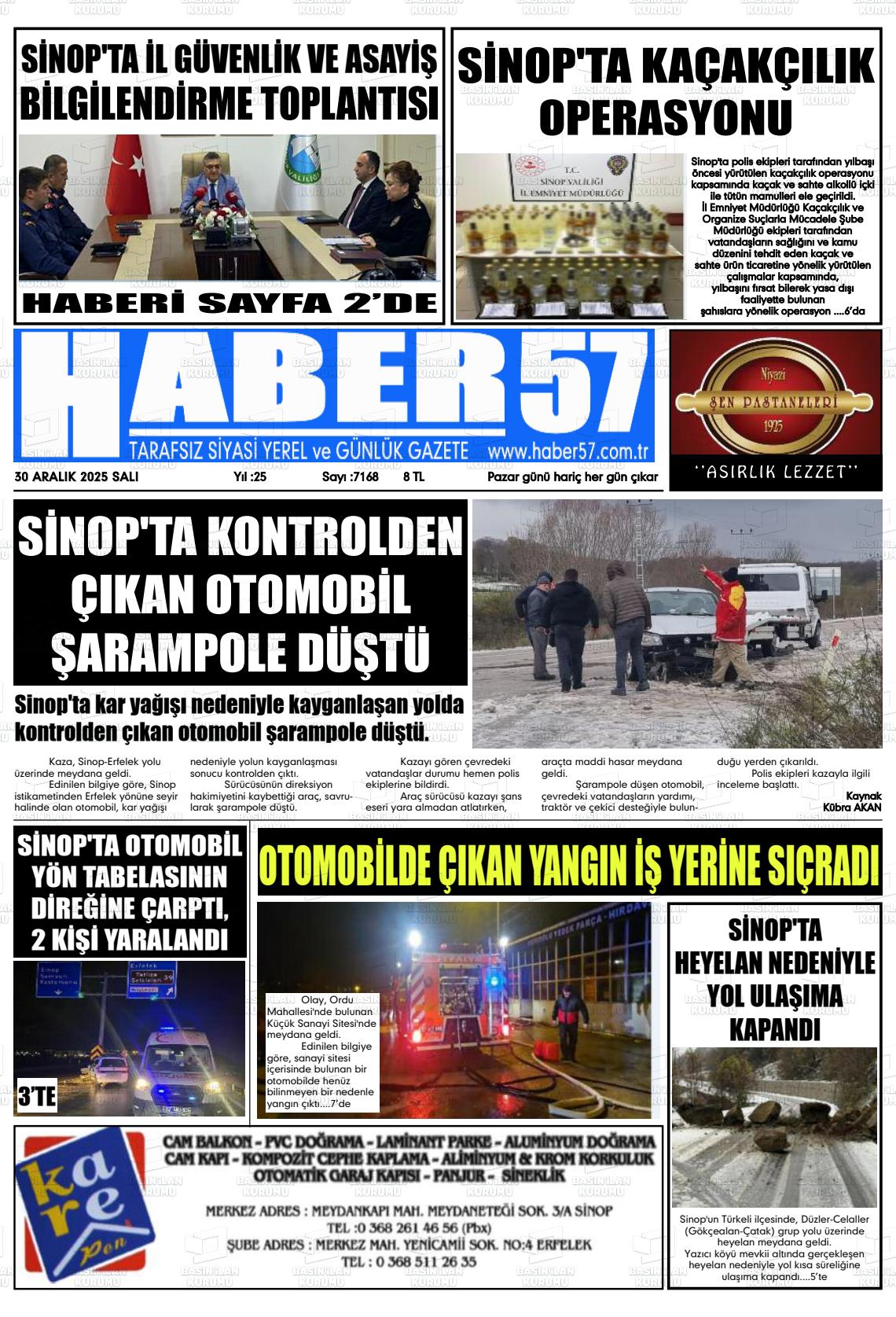 Sİnop Yerel Gazeteleri 30 Aralık 2025, Salı Günü Manşeti